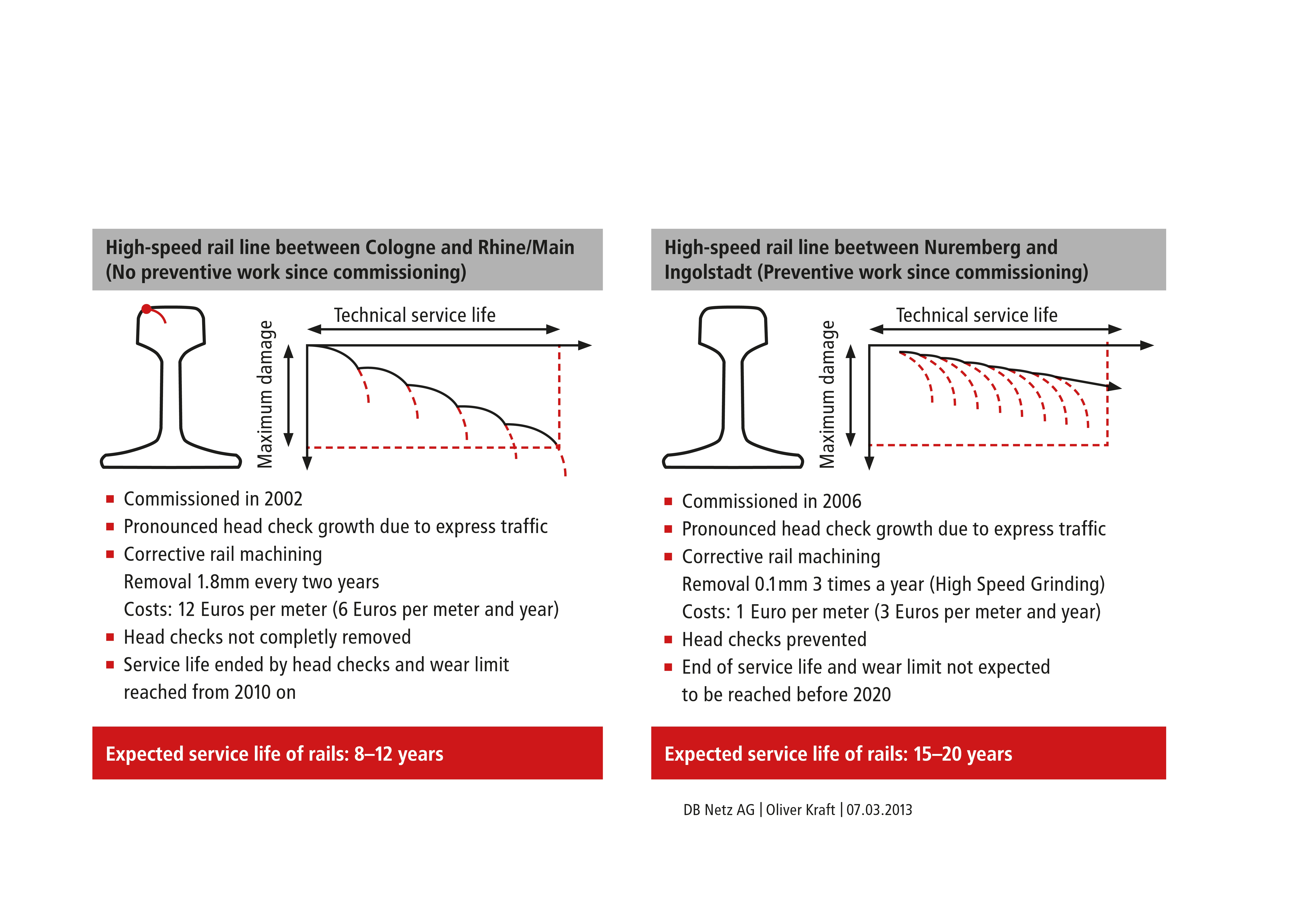 A material removal of 0.1 mm is sufficient to prevent the formation of surface cracks, which could otherwise spread deeper into the metal and lead to rail fractures. A rail surface that is continuously maintained in optimal condition reduces wear on the superstructure and rolling stock. This extends the service life of the rail in the track and significantly reduces life cycle costs along with rail noise emissions. According to a study by the Technical University of Berlin, regular preventive grinding of rail surfaces using Vossloh’s High Speed Grinding (HSG) technology can reduce lifecycle costs on heavily used urban and long-distance rail lines by 50 to 61 % compared to conventional methods. This significant reduction is due to the extension of the service life of the rails through preventive HSG treatment.