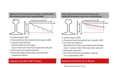 Depending on the condition of the rail at the time the network operator decides to start preventive grinding, prior rail milling may be essential in order to create a basis for the desired quality. Milling also reprofiles the rail head in the case of deeper defects that extend up to 3 mm into the rail. This mobile treatment also offers a cost-effective alternative to rail replacement. According to Vossloh's calculations, the cost of replacing a rail in the track bed is about 15 times higher than the cost of milling. The time and cost involved in planning the rail replacement is also significantly higher than for milling work.