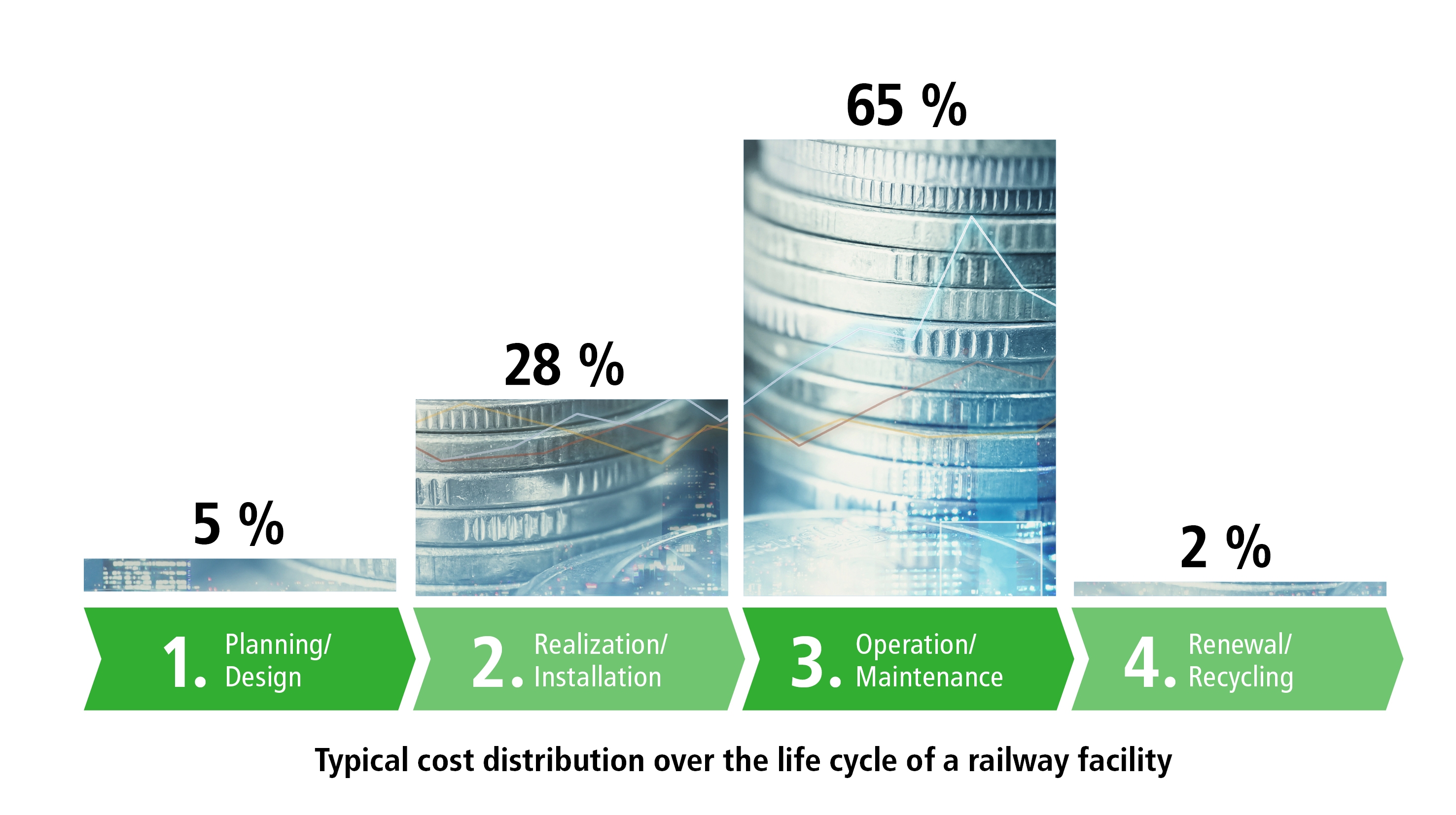The life cycle spans several decades, from planning and installation to operational use and renewal. It is therefore advisable to take the costs of all life cycle phases into account as early as the design and planning phase. Ultimately, over 95% of follow-up costs are determined at the point of investment – 65% of which arise during the operational phase. This also highlights the key role that an intelligent maintenance strategy plays in asset management. With their disruptive power, digitalization and artificial intelligence are seen as beacons of hope for mastering the ever-increasing demands on the reliability of railway infrastructure and for being able to assess and plan future maintenance requirements more accurately.