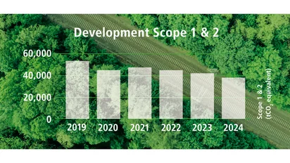 Vossloh aims to achieve carbon neutrality in its own business operations (Scope 1 and 2) by 2030. This goal was incorporated into Vossloh's sustainability strategy at an early stage in order to mitigate and adapt to physical and transitory risks associated with climate change. This target also enabled Vossloh to keep pace with developments among customers, markets, and environmental requirements. The necessary reduction in CO2e intensity of 11 percent per year is backed by concrete measures and CO2e budgets. Remaining – locked-in – emissions must then be compensated. Vossloh is also currently working on solutions to reduce indirect (Scope 3) emissions measured for the first time in 2024, which are largely beyond its direct control.