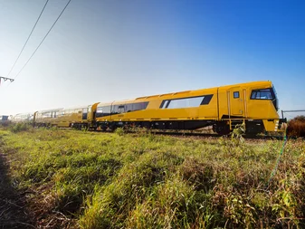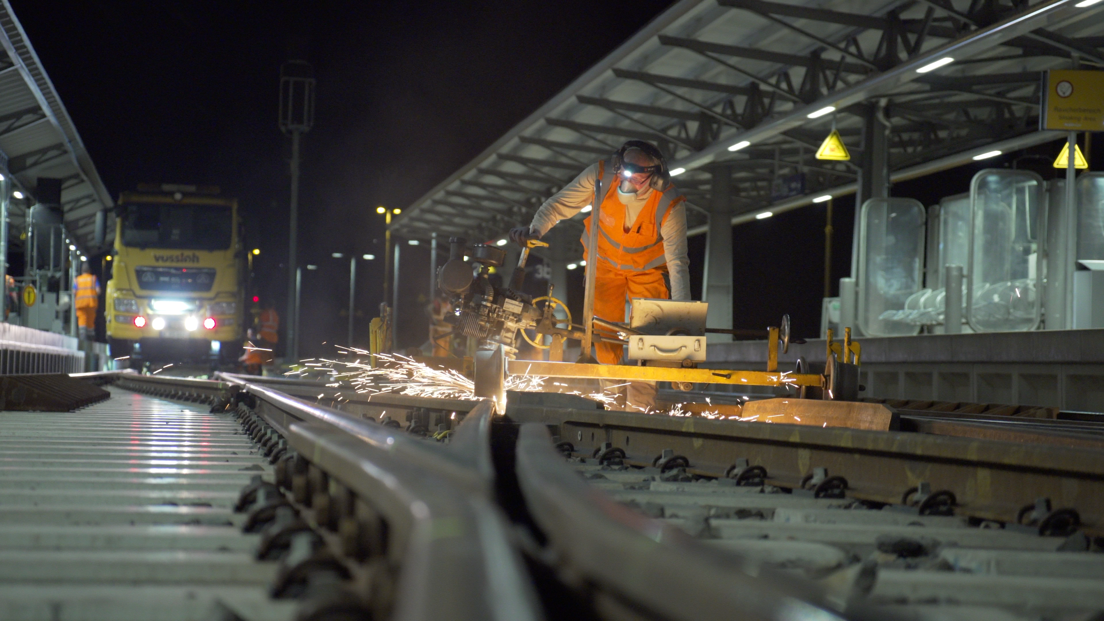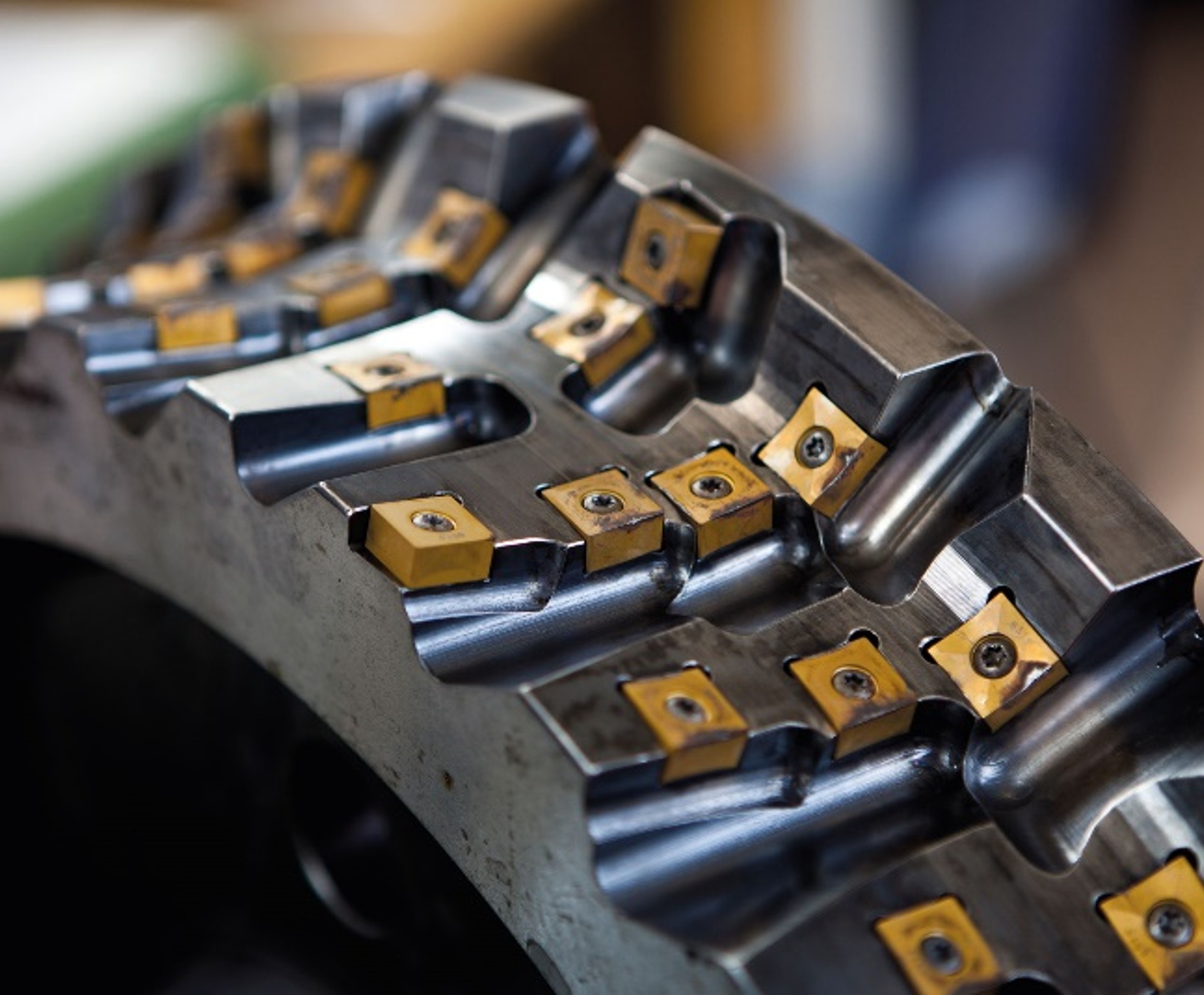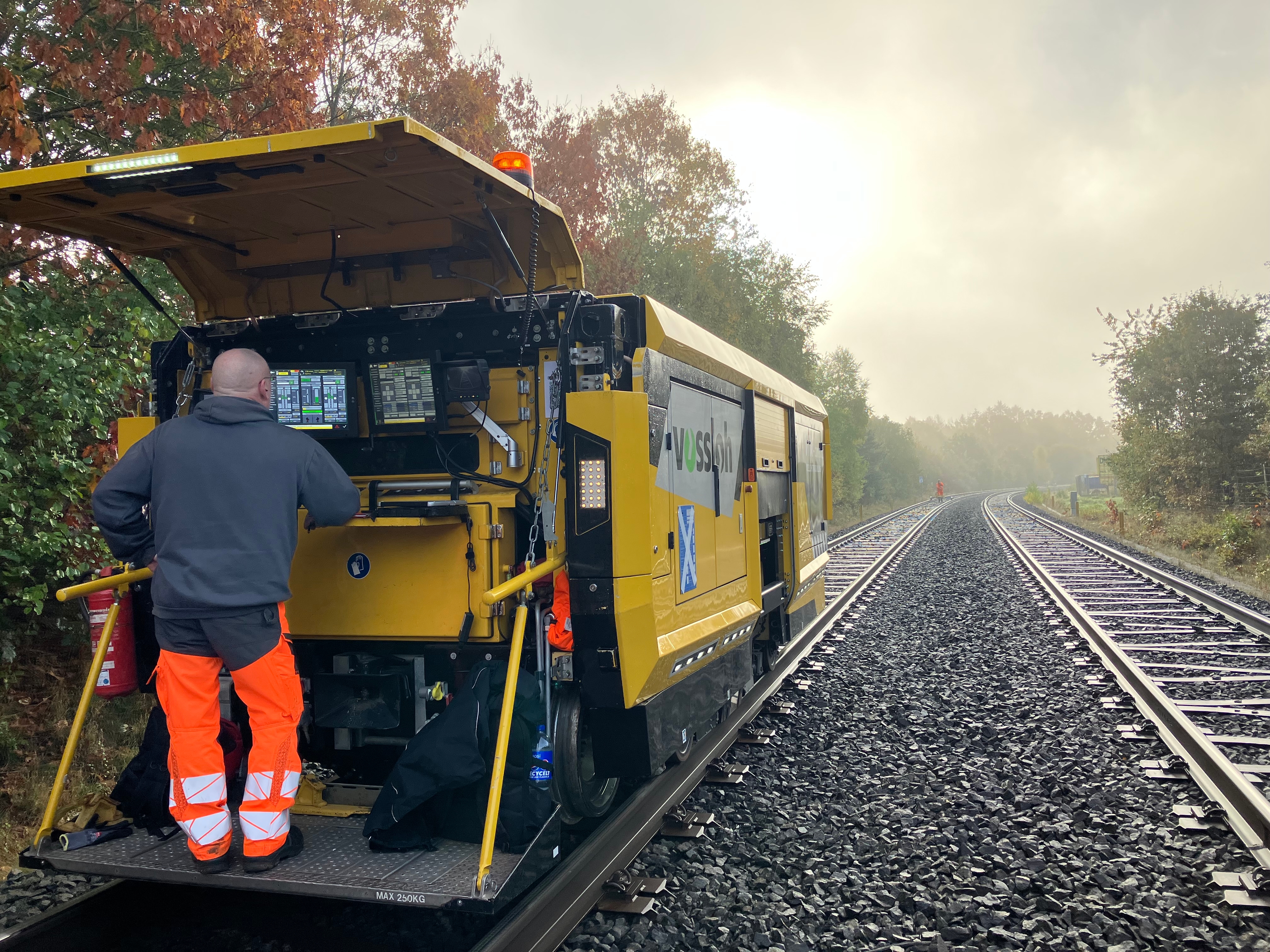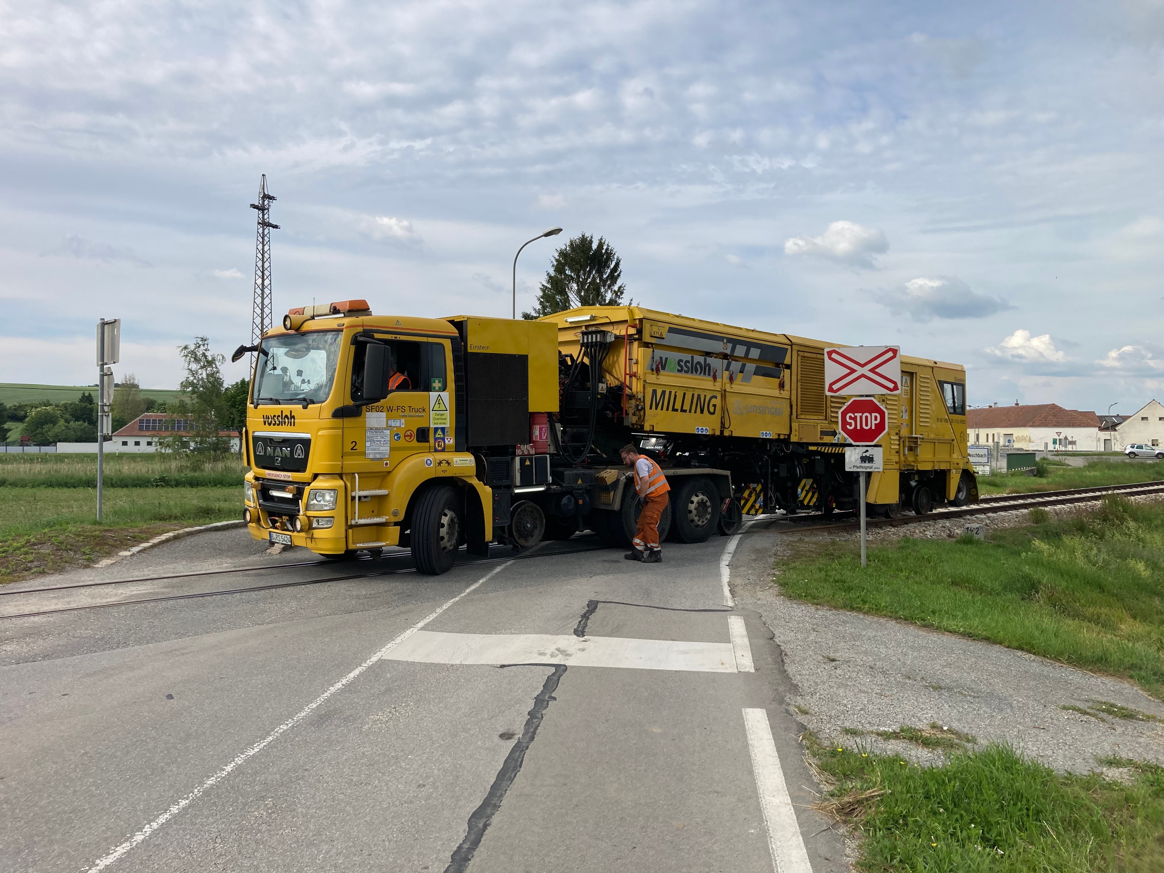 Unlike rail grinding, milling is a chip-removal process. Numerous cutting tools are mounted on a rotating milling wheel, which is guided longitudinally along the rail. The design and configuration of the milling tool vary depending on the requested operation and the required rail profile. During the milling process, which is controlled to within a tenth of a millimeter, high removal rates can be achieved per pass; depending on the machine, these range from 0.3 mm (the minimum removal rate due to the technology) to 2.0 mm on the rail surface and a maximum of 2.5 mm per running edge in one pass. This means that the optimum track gauge can be restored after wear-induced changes to the track gauge by means of gauge correction milling. On the other hand, the milling plates are arranged to match the target profile of the rail head, ensuring a continuous transverse profile.