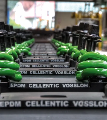 Modern rail fastening systems offer the necessary elasticity to ensure that forces caused by track and wheel irregularities do not lead to excessive wear or damage that causes vibrations and structure-borne noise. cellentic plays a key role in dampening these vibrations in the form of highly elastic intermediate layers or intermediate plates; the elastomers are individually cut to size for turnouts.