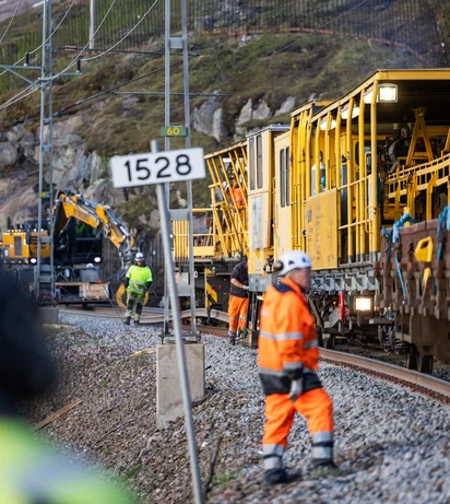 In this way, 106,200 m of rail were replaced and seamlessly welded in less than a month. Generally, 36 rails, each 120 m long, are delivered and laid per shift; for this project, the record was 66 rails, each 120 m long—meaning 7,920 m of rail (3,960 m of track) in one shift. Due to the steep gradients, up to four locomotives were needed to transport such a large number of rails to the track.