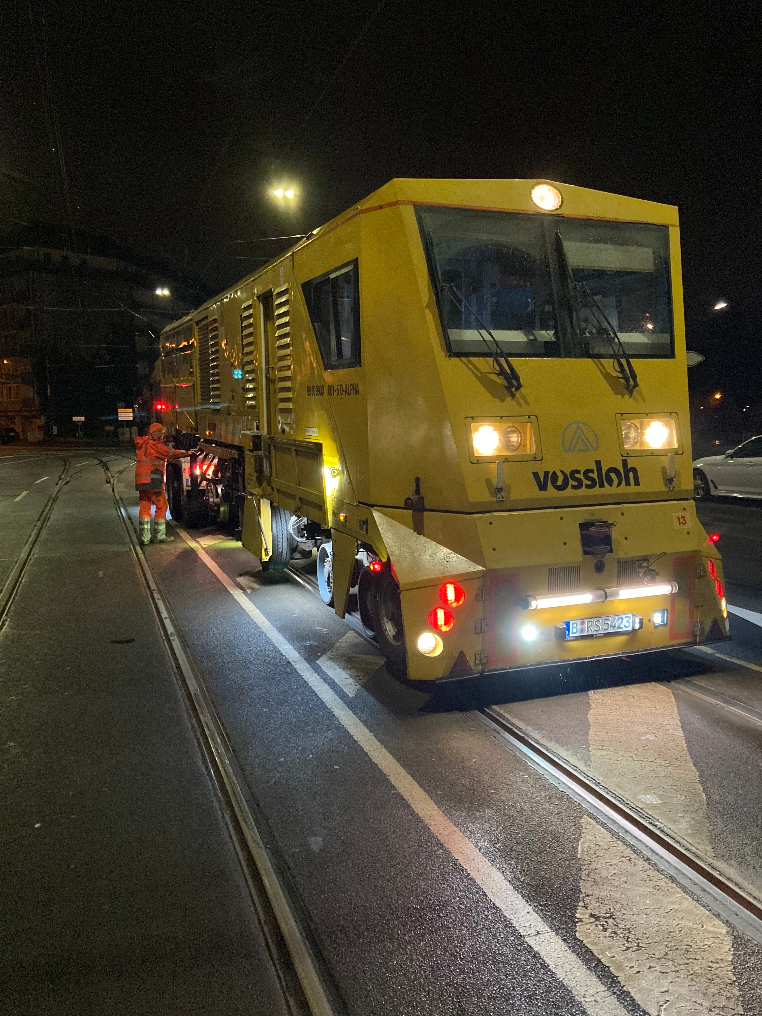 Up until now it hasn’t been possible to correctively machine grooved rails without removing the sealing compound that runs virtually flush along the rail’s outside edge. The special tool on our road-rail milling truck has a wheel flange equipped with cutting tips. With this tool it is now possible to rectify defects in a single pass without great expenditure and with deeper radius machining. A positive-tangent cutting angle starting at Y+0 also enables us to achieve a cutting zone that extends to Z-22 mm on the rail’s running edge. With larger removal rates, this prevents the wheel flanges on the trams’ wheels from bottoming out in the rail groove.