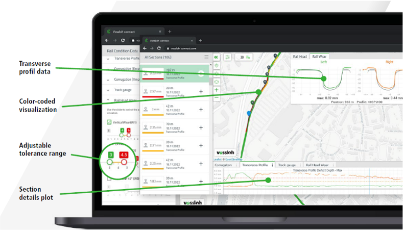 In order to keep the route network efficient – taking into account the given budgetary constraints – it is advisable to differentiate rail processing according to location and type. The digital networking of rail diagnostics and processing gives the smart HSG-city a new dimension in customer use: instead of the "watering can” approach, in which complete track sections are ground uniformly, often resulting in unnecessary treatment of some areas and insufficient attention to others, Vossloh’s Smart Maintenance delivers a holistic concept for condition-based rail maintenance and full transparency: from inspection and monitoring to clearly derived maintenance scenarios, including cost analysis, through to the corresponding maintenance measures. At the same time, the software-supported maintenance approach enables plant managers to use their budgets more efficiently and retrospectively assess the effectiveness of their actions.